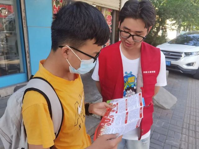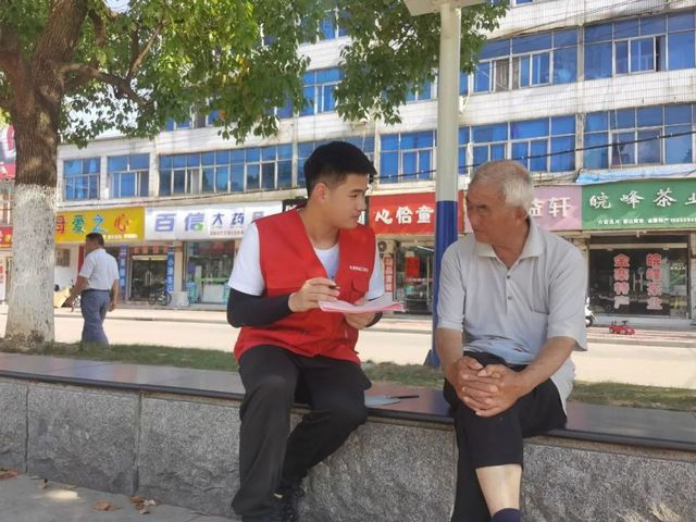 在紅軍廣場,調研團隊成員就金寨縣鄉(xiāng)村振興政策對紅軍廣場周邊居民進行社會調研及宣傳,并發(fā)放黨史學習與疫情防控宣傳手冊。