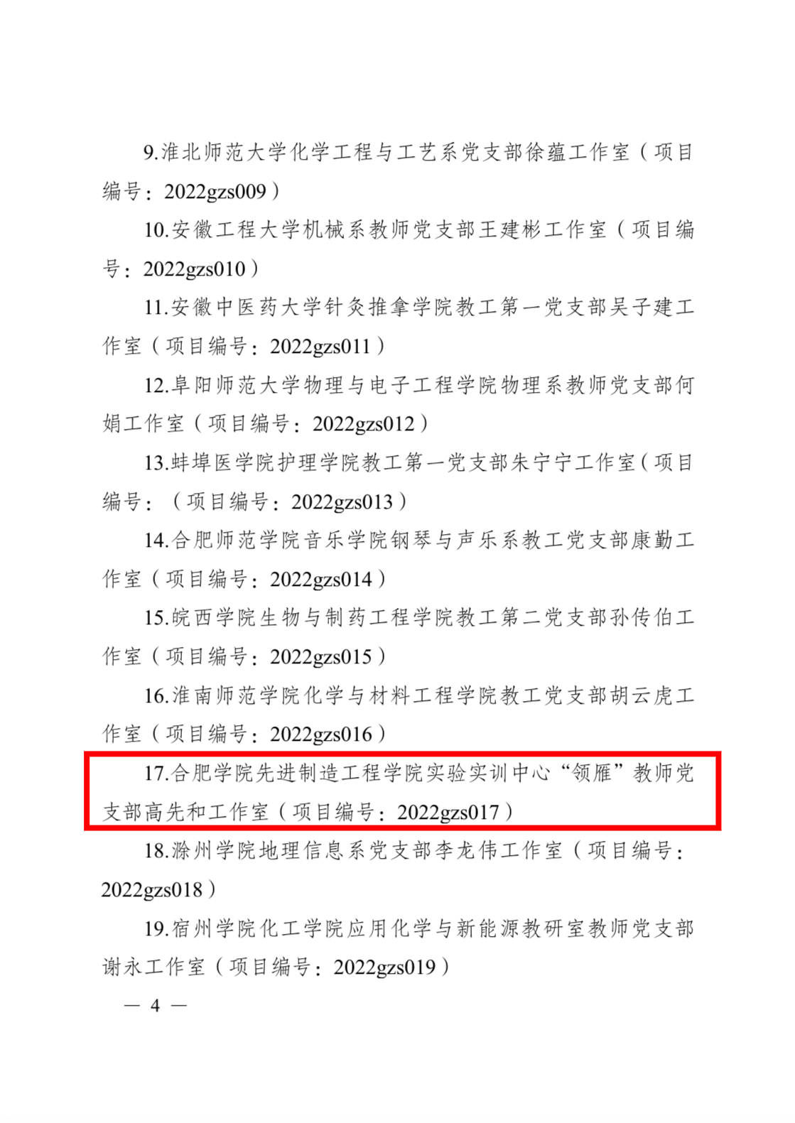 近日,中共安徽省委教育工委印發《關于公布首批全省高校 “雙帶頭人”教師黨支部書記工作室立項建設名單的通知》 (皖教工委函〔2022655 ),合肥學院先進制造工程學院實驗實訓中心黨支部高先和工作室成功獲評首批全省高校“雙帶頭人”教師支部書記工作室,這是合肥學院先進制造工程學院實驗實訓中心黨支部黨建工作取得的新突破。