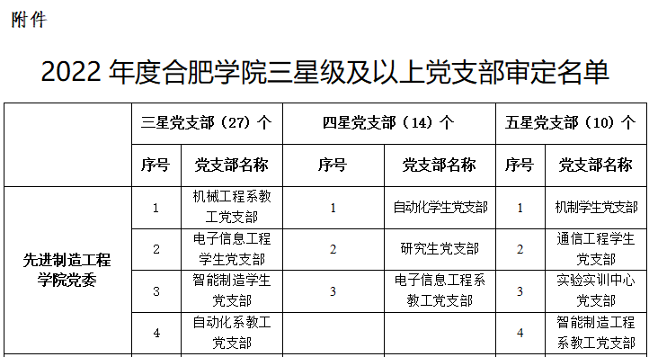 近日,中共合肥學院委員會發布了關于公布2022年度合肥學院三星級及以上黨支部驗收審定結果的通知》,先進制造工程學院11個黨支部全部創星晉級,并達到“三星級黨支部”以上建設標準。其中,3個黨支部獲評四星級黨支部4個黨支部更是獲評星級黨支部