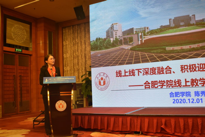 陳秀以《線上線下有機融合、積極迎接“新教育形態(tài)”:合肥學(xué)院線上教學(xué)的實踐與探索》為題作報告。她從新時代中國高等教育發(fā)展面臨新形態(tài)、疫情期間合肥學(xué)院線上教學(xué)實踐回顧、未來探索線上線下深度融合的新思路這三個方面作了詳細(xì)匯報。陳秀提到“金課”和“一流課程”兩個關(guān)鍵詞,展示了疫情防控背景下在線教育教學(xué)的工作思路,總結(jié)了疫情期間合肥學(xué)院線上教學(xué)六大創(chuàng)新做法。