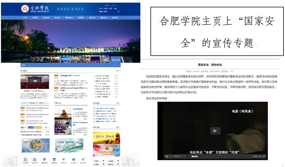 為了使廣大師生更好地學習了解《反間諜法》,進一步增強國家安全意識,合肥學院國際合作交流處積極部署反間諜法宣傳的相關工作,利用校園多個平臺向全校師生普及反奸防諜知識,并組織專家為單位開展反奸防諜的講座報告。首先,國際交流合作處充分利用學校的網絡資源,在首頁醒目位置設立國家安全專題,同學們可以通過首頁點擊到國家安全宣傳主頁http://www.5hj90lf.xyz/dd/f2/c14a56818/page.htm,接受國家安全的相關知識教育和觀看反間諜案例。國家安全宣傳主題作為學校常駐頁碼,一年365天無休向師生宣傳。