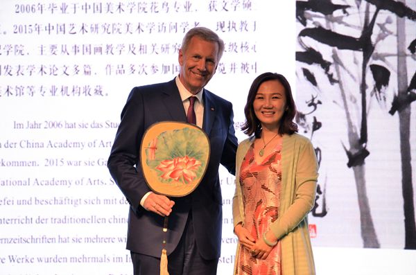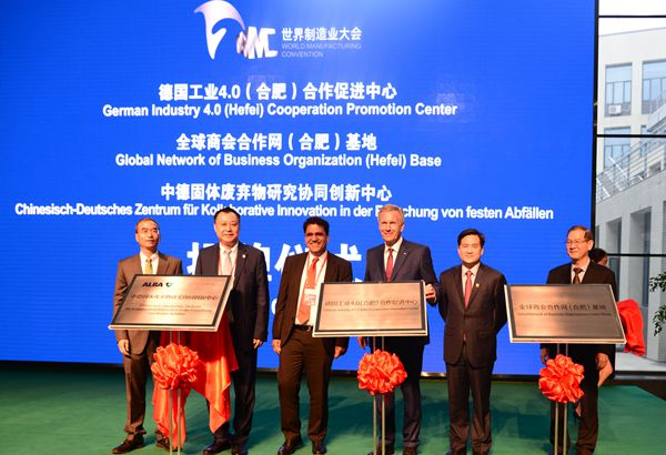 儀式上,武爾夫、曹方、納賽爾、毛存光、蔡敬民、王其東共同為中德先進(jìn)制造業(yè)(合肥)合作促進(jìn)中心、全球商會(huì)合作網(wǎng)基地、中德固體廢棄物研究協(xié)同創(chuàng)新中心揭牌。合肥學(xué)院教師陶莉向武爾夫贈(zèng)送由其創(chuàng)作的中國傳統(tǒng)藝術(shù)品團(tuán)扇。