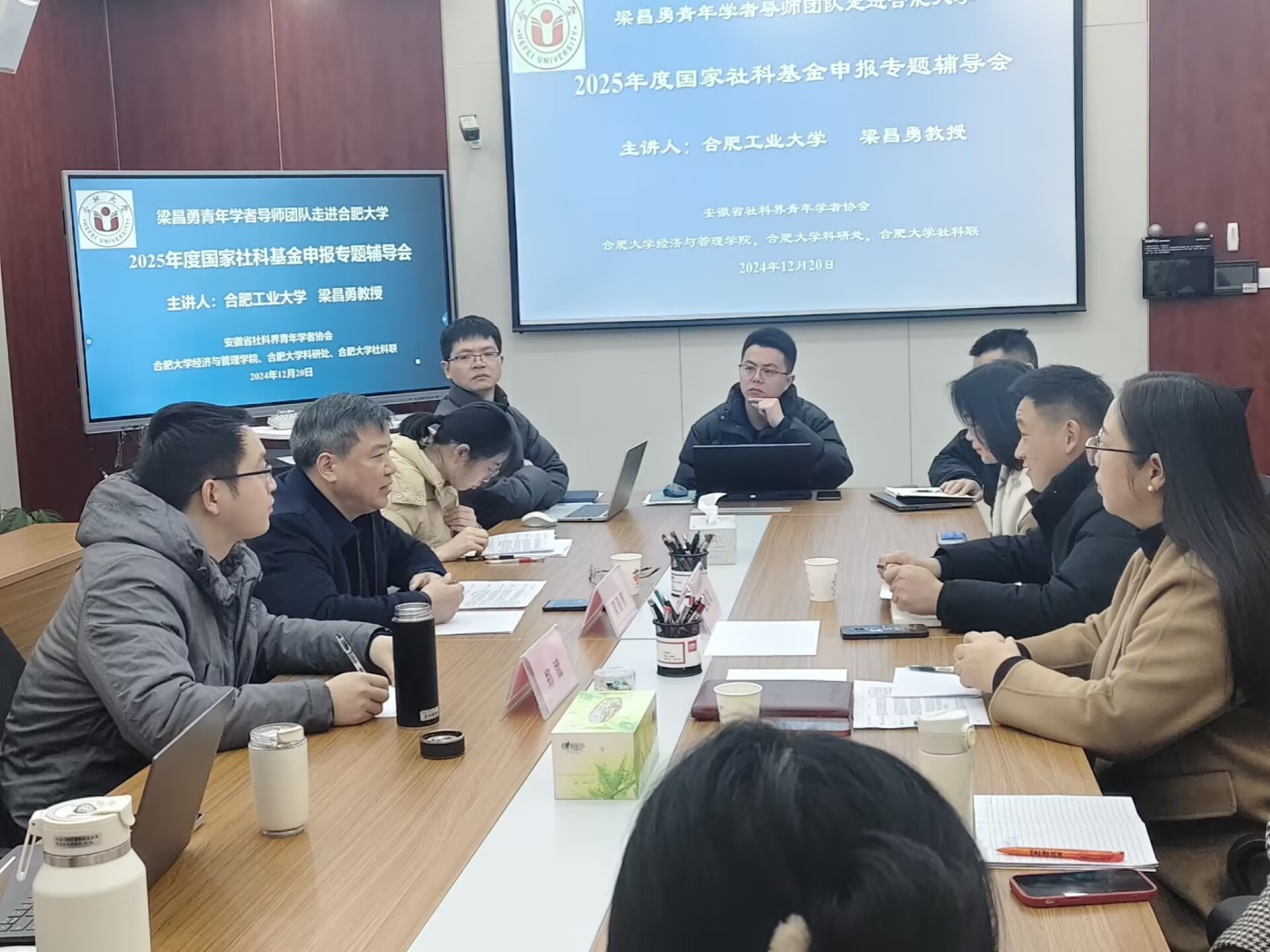 12月20日,梁昌勇青年學者導師團隊走進合肥大學,在經濟與管理學院四棟二樓會議室成功舉行2025年度國家社科基金申報專題輔導會。本次會議由安徽省社科界青年學者協會主辦,合肥大學經濟與管理學院、合肥大學科研處、合肥大學社科聯協辦。省社科聯鄭斌與會指導,會議由合肥大學科研處處長王儲炎主持,中國科學技術大學、安徽大學、安徽醫科大學、皖西學院和我校多名教師積極參會進行學習交流。