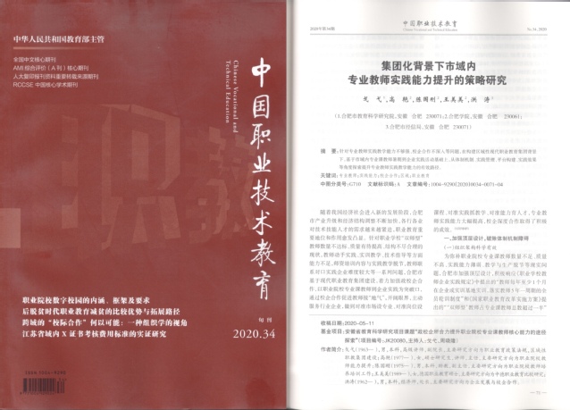 2021年1月,我中心收到《中國(guó)職業(yè)技術(shù)教育》雜志寄來(lái)的刊物,高艷、陳國(guó)剛、王美美等同志與合肥市教育科學(xué)研究院、合肥市經(jīng)信局等專(zhuān)家共同撰寫(xiě)的《集團(tuán)化背景下市域內(nèi)專(zhuān)業(yè)教師實(shí)踐能力提升的策略研究》在該刊2020.34期發(fā)表。《中國(guó)職業(yè)技術(shù)教育》由國(guó)家教育部主管,是全國(guó)中文核心期刊,在職業(yè)教育界具有重要影響。