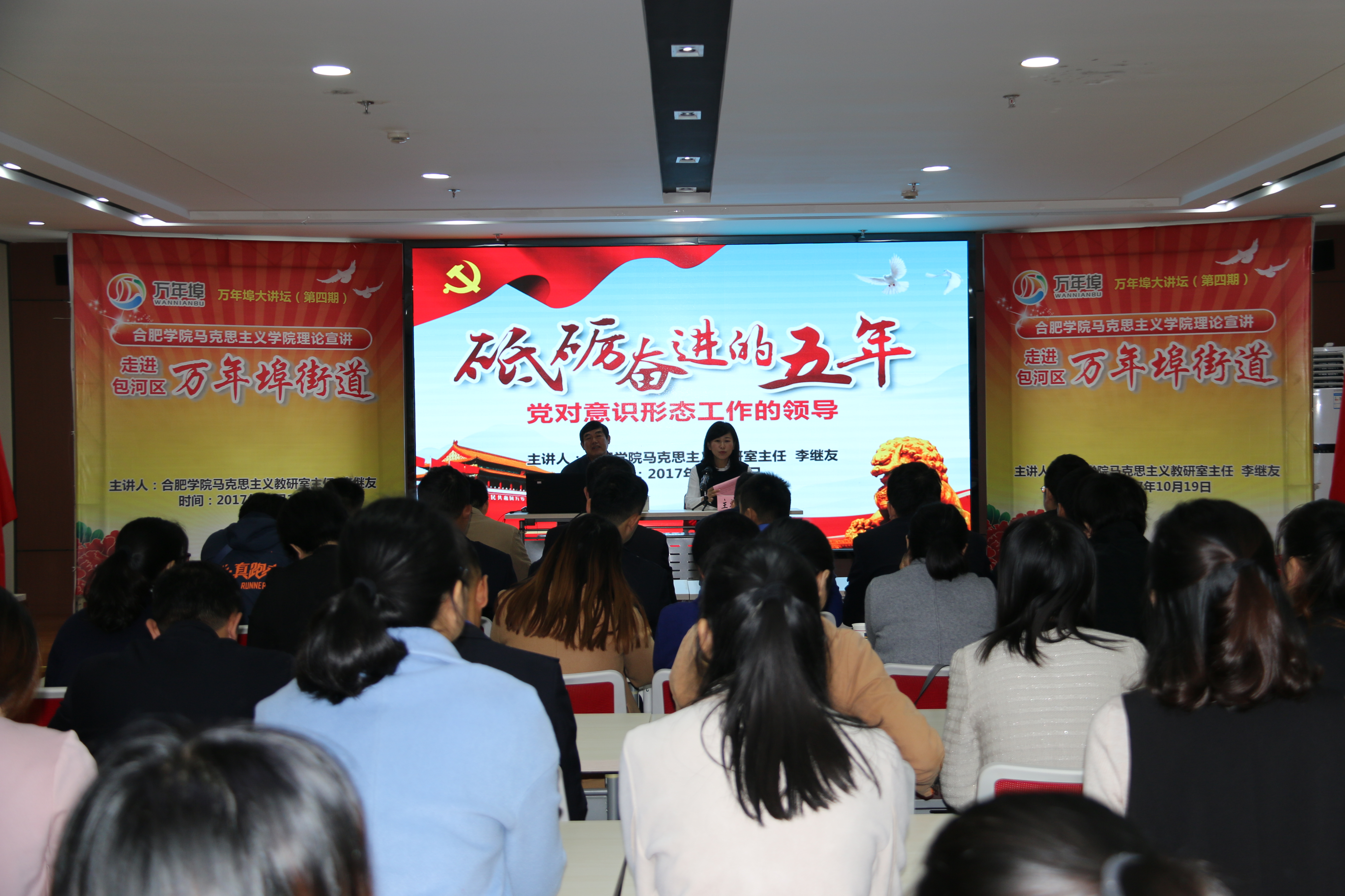 要把理論送進基層,培入人心,不僅需要專業(yè)的人講專業(yè)的課,更要把一些理論性的東西用這種鮮活事例的形式表達。在十九大“習近平新時代中國特色社會主義思想”及“砥礪奮進的五年”9個主題宣講活動中,合肥學院老師們利用課余時間,深入到各社區(qū)街道,來到群眾身邊,積極宣講黨的偉大成就,深入淺出的講解博得了在場同志的陣陣掌聲。每個社區(qū)街道少則數(shù)十人,多則幾百人前來聆聽講座。到課的社區(qū)黨員和居民們通過理論宣講活動,對國內(nèi)外形勢有了更加深刻且全面的了解,大家紛紛表示,老師們的講座內(nèi)涵豐富、資料詳實,這樣的理論政策宣講形式既把黨和國家的大政方針、也把群眾最關(guān)心的問題講解得十分明白、透徹。
