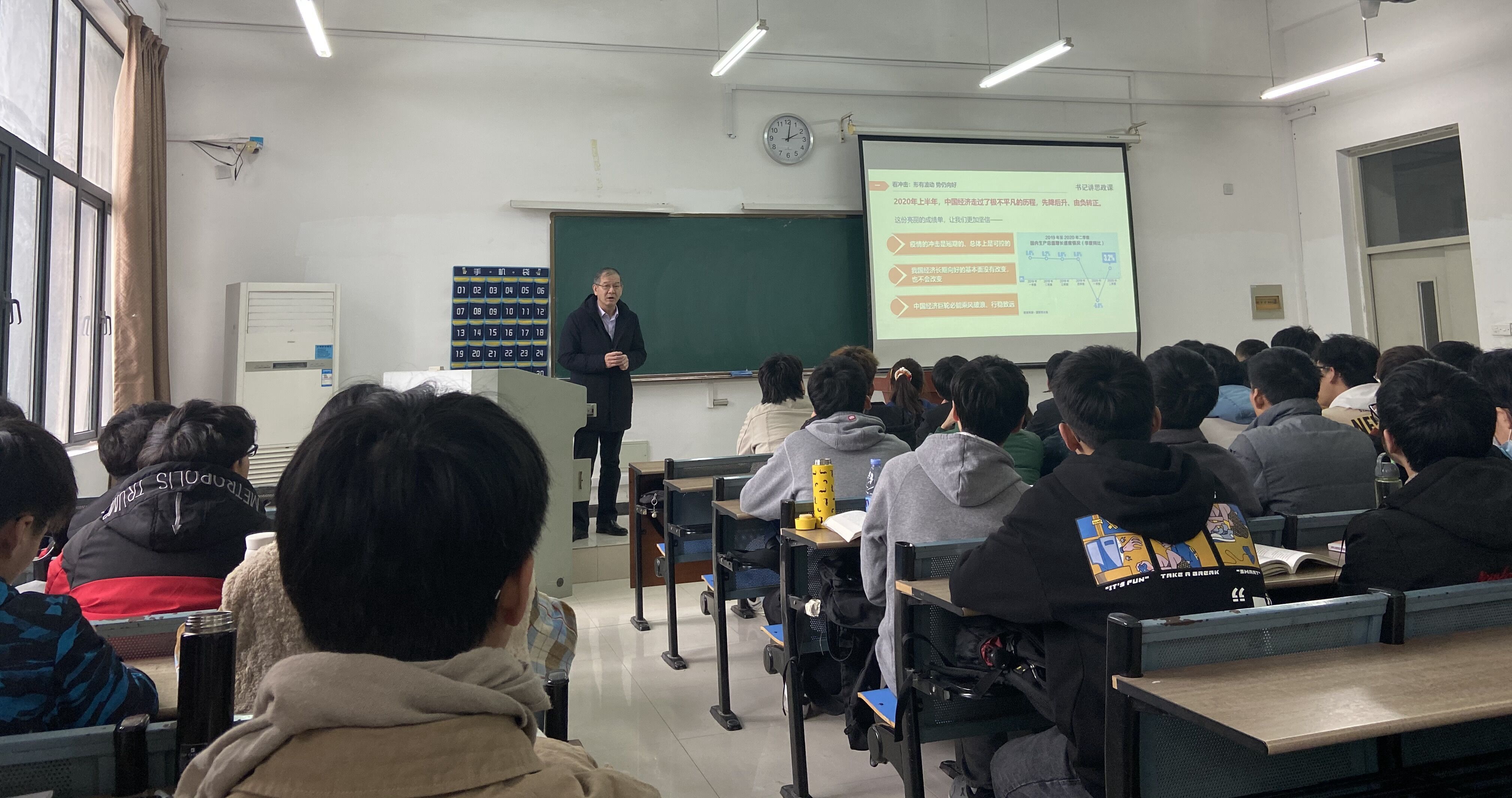 12月10日下午,校黨委書記王其東在35號樓,以“全面辯證長遠看待我國經濟發展”為題,為19級能源化學與工程、無機非金屬材料與工程、化學工程與工藝專業學生上《形勢與政策課》,受到同學們的熱烈歡迎。